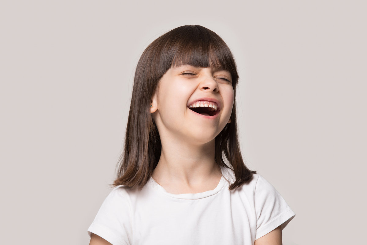 Headshot of excited small preschooler girl isolated on grey studio background laugh at funny joke, overjoyed happy little child have fun giggle chuckle feel amused, kid humor, entertainment concept